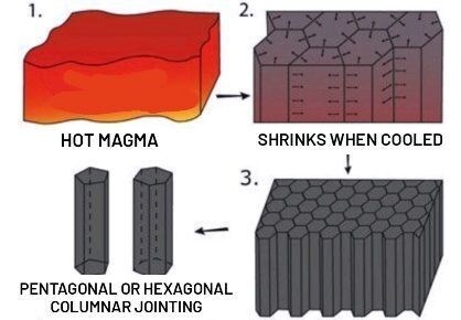 1) Explain how the columnar jointing of basalt occurs.