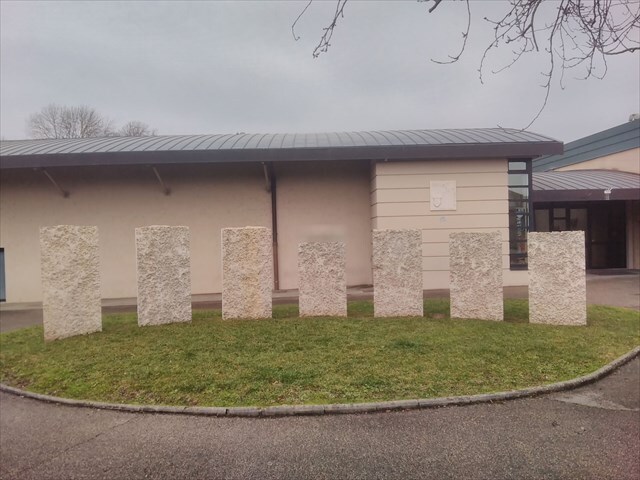 Waypoint 5 : Vous êtes devant le Stonehenge de Montalieu. Les blocs sont disposés de manière décroissante afin de créer un effet optique. Au nombre de 7, ils représentent les 7 communes du bassin carrier, participant aux Journées de la Pierre. Réalisée en pierre de Villebois en 2014 lors des Journées de la Pierre.