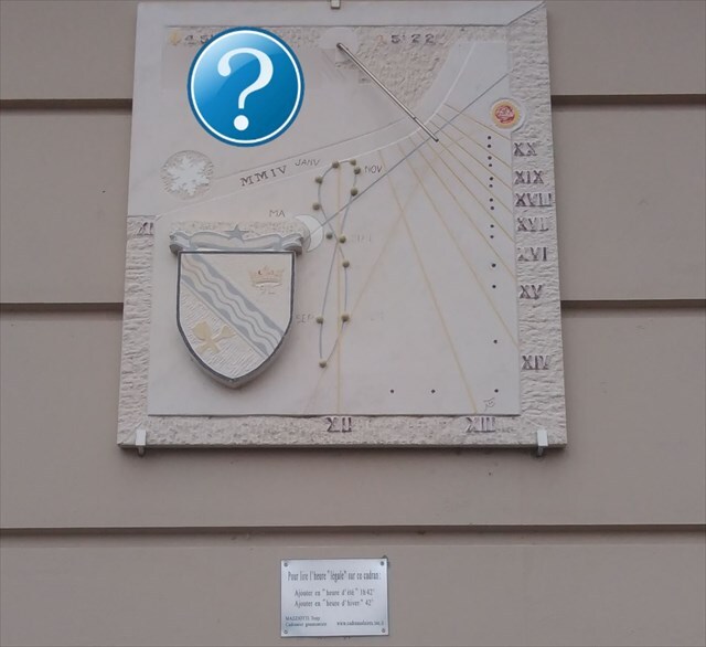 Waypoint 6 : Vous vous trouvez désormais face au cadran solaire implanté sur cette façade, Il n'est pas très facile de lire l'heure, vous pouvez vous y essayer en suivant les inscriptions de la plaque. Comme presque tous les cadrans solaires, il comporte une devise.