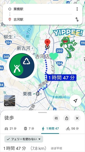 栗橋駅から古河駅までのGoogleナビで調べると最短コースで7.8km、1時間47分と出てきました⌚️