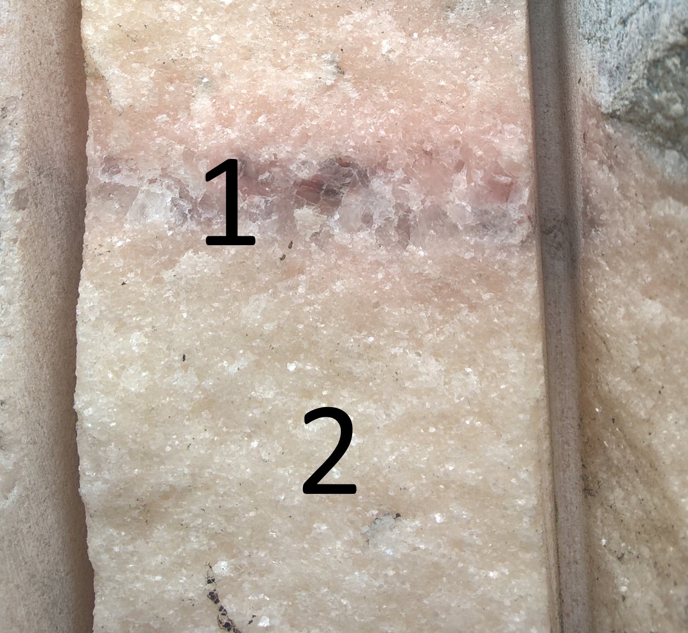Die Rekristallisation im Marmor tritt auf, wenn Kalkstein intensiven metamorphischen Bedingungen ausgesetzt wird, wobei die Mineralien umorganisiert werden und das Gestein dichter und kompakter wird. Je nach Intensität des Prozesses kann die Textur des Marmors variieren, wobei sie entweder granular (mit mit bloßem Auge sichtbaren Kristallen) oder foliert (wenn die Kristalle parallel ausgerichtet sind) sein kann. Im letzteren Fall kann man die Ausrichtung der Minerale in Bändern oder Schichten erkennen. Die Schicht ist immer senkrecht zur auf das Gestein ausgeübten Kraft während seiner Entstehung.