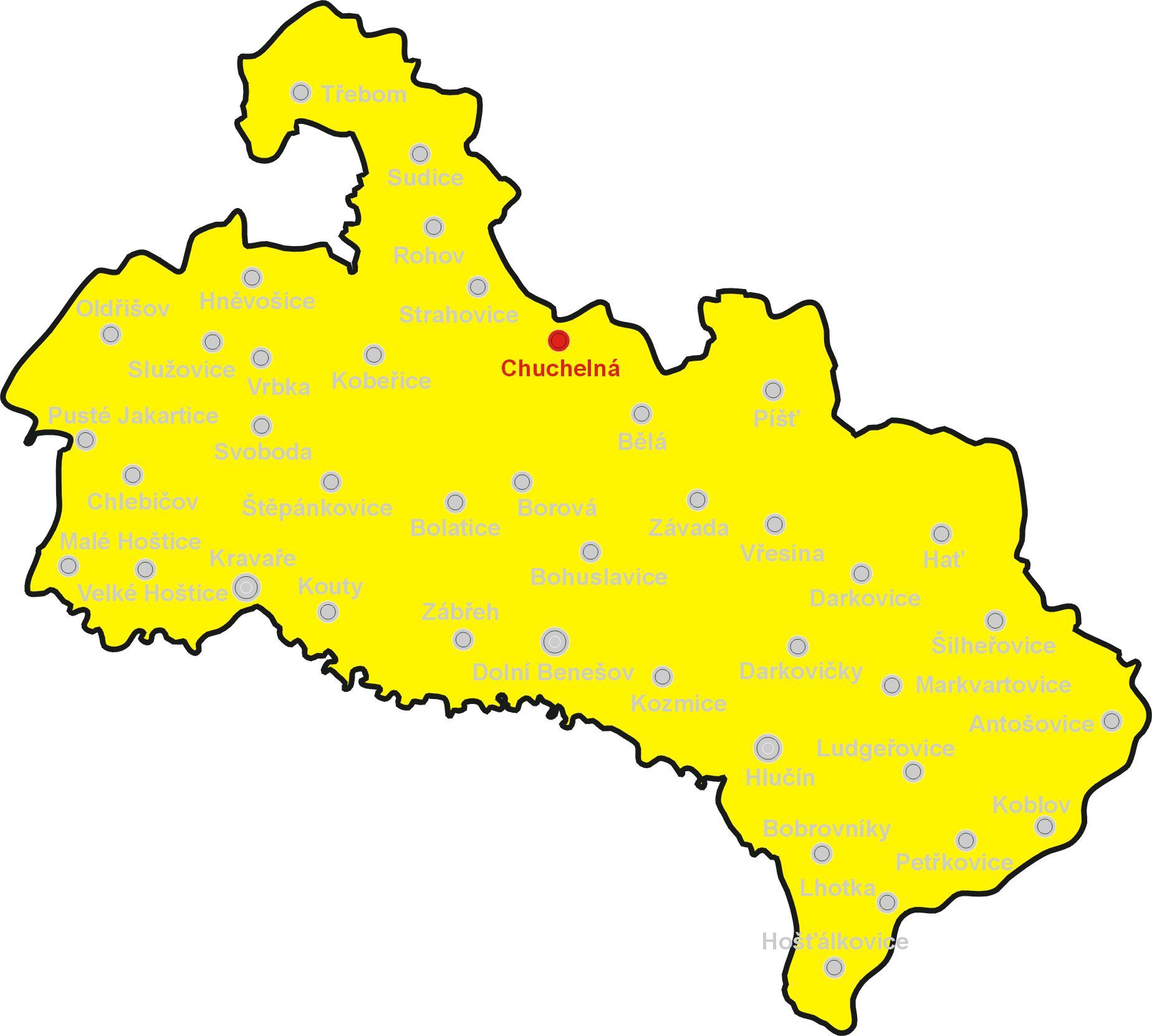 Obec Chuchelná se nachází v severní části Prajzské republiky u hranic s Polskem. První písemná zmínka je uvedena v rejstříku tzv. mostného ospu z roku 1349 - „Magna a Parva Chuchelna“.