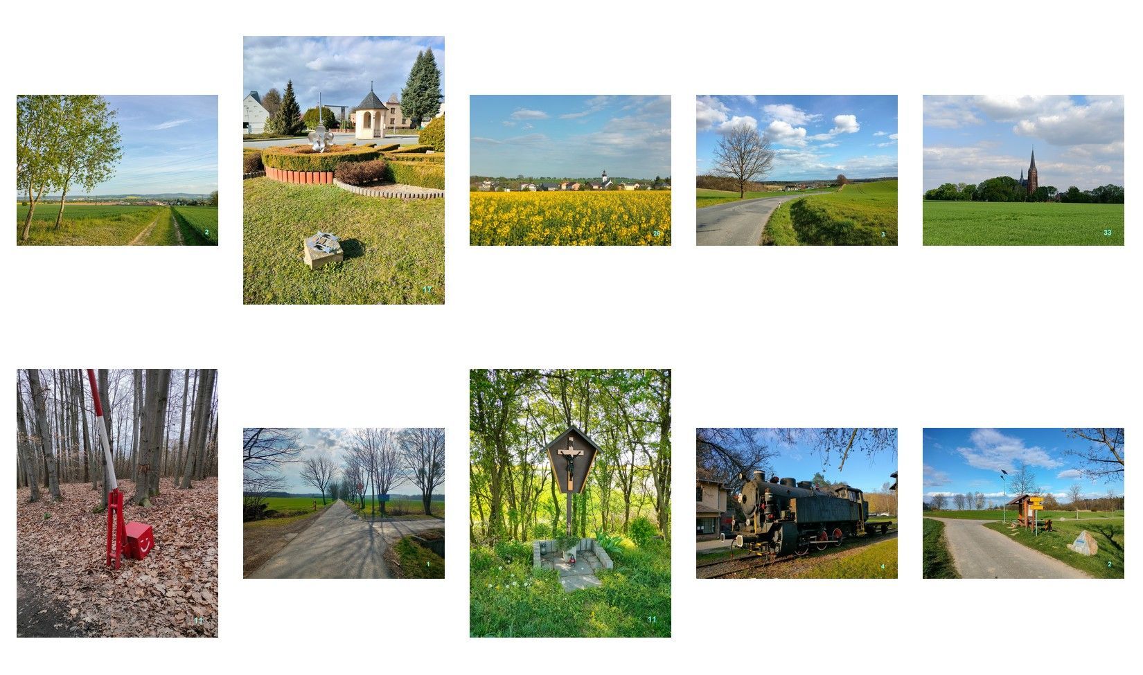 Jde o deset fotografií z míst, která jste určitě během svého putování navštívili. V galerii naleznate jednotlivé fotografie PR 01 - PR 10 ve větším rozlišení. Vaším úkolem je nejdříve tyto obrázky abecedně setřídit podle názvů obcí, kterým byla daná keš věnována.