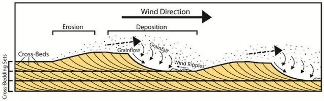 A geologic feature commonly associated with sandstone is cross bedding, which is formed when layers of sand or sediment are deposited at an angle to the main bedding plane. This typically occurs in environments with directional flow like in rivers (water) or deserts (wind), transport sediment and deposit it at an angle as ripples or dunes form and migrate. The sloping layers created by this process, called cross beds, are preserved in the rock and indicate the direction of flow at the time of deposition.