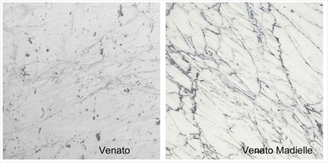 Veined marble (24.8% of production share) is known for its bold, dark veining set against a white or light gray background. The image above shows two examples. These patterns formed when minerals like iron or graphite were present during metamorphism, becoming embedded in the stone as it recrystallized. As the original limestone was exposed to heat and pressure, it transformed into marble, and the impurities created the bold veining that makes this variety stand out. Unlike White Carrara, which has a softer, more uniform appearance, veined marble offers more contrast and movement.