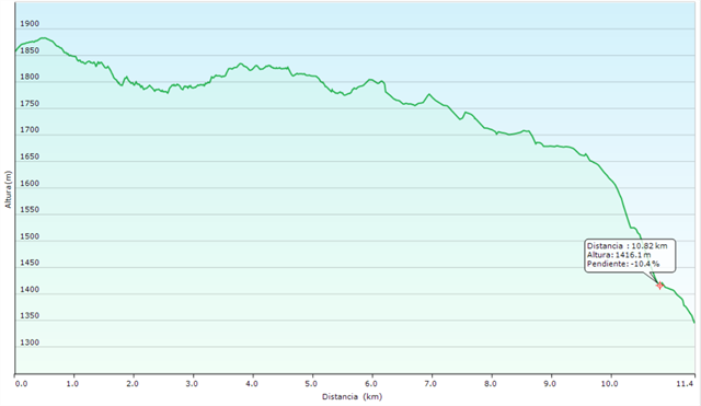 - El recorrido tiene una longitud de 11,4 kilómetros aproximadamente, con un ascenso de unos 232 m y un descenso de 745 m.