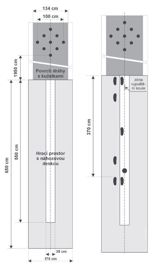 Na obrázku je vyobrazena závodní kuželkářská dráha včetně nejdůležitějších rozměrových parametrů. Hrací prostor délky 650 cm a šířky 170 cm je ohraničen bílou čárou širokou 5 cm. V podélné ose je umístěno náhozová deska (délka 550 cm, šířka 35 cm); jen na něj je možné položit při provádění hodu kouli. Na hrací prostor navazuje vlastní dráha zakončená prostorem, ve kterém jsou umístěny kuželky.