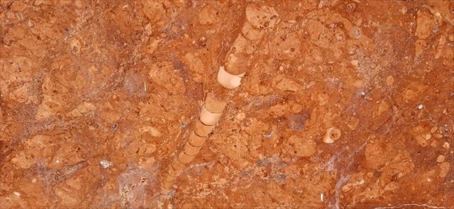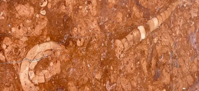 Rosso Verona Marble (a.k.a. “Red Verona Marble”) is a Jurassic-aged, hematitic, stylolitized, nodular limestone from Verona Province in northern Italy. The lighter-colored areas (nodules) have been attributed to soft-sediment deformation. Some samples have fossil ammonite shells (Mollusca, Cephalopoda, Ammonoidea, Ammonitida). This limestone represents part of a condensed succession of sediments deposited on an ancient submarine plateau, the Trento Plateau.