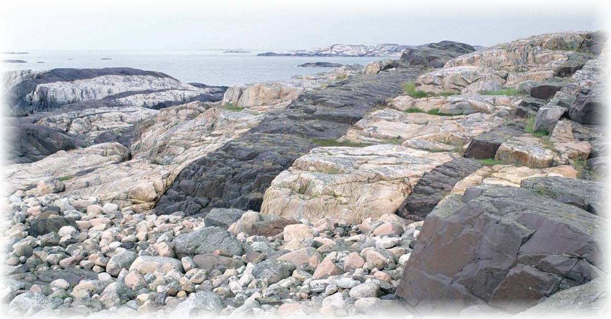 Blant disse gamle, lyse granittiske bergartene finner man små inntrengninger av en mørkere, mafisk bergart: diabas.