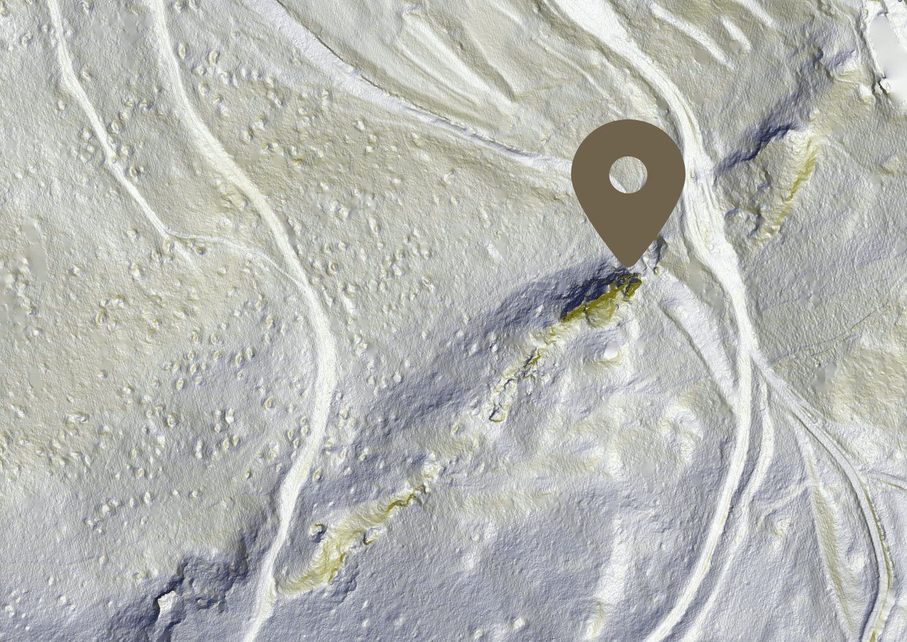 LiDAR-ová snímka lokality, kde sa aktuálne nachádzate. Smerovanie žily Terézia je zrejmé.