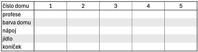 Pět domů vedle sebe, očíslovaných zleva doprava 1–5.