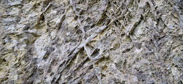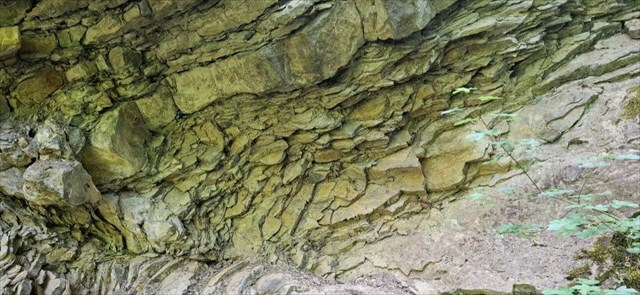 2) Prozkoumejte lomovou stěnu, měli byste si všimnout malé červené šipky. Nad ní najdete zajímavé křemenné žíly. Ve které hornině jsou usazené a proč jsou podle vás vystouplé?