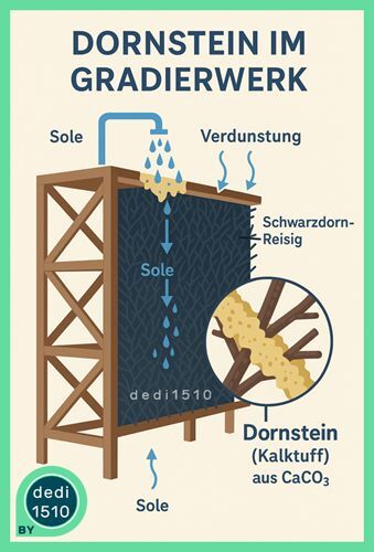 Das Gradierwerk muss regelmäßig gewartet werden, weil die mineralischen Ablagerungen die Zweige verstopfen. Das alte Dornreisig wird entfernt und erneuert. Manchmal bleiben sogar Abdrücke der Zweige im Dornstein erhalten, fast wie kleine Fossilien. Chemisch ähnelt die Entstehung dem Tropfstein in Höhlen: Kalk fällt aus, weil Kohlendioxid aus der Sole entweicht (Ca(HCO₃)₂ → CaCO₃ + CO₂ + H₂O).