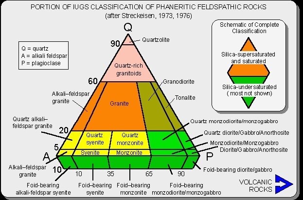 The colored regions indicate whether the rock is undersaturated, silica-saturated, or oversaturated. Rocks that are silica-undersaturated will crystallize silica poor minerals like feldspathoids (minerals chemically similar to felspars but with less silica) or olivine. Rocks that are silica-saturated have just enough silica and contain neither quartz nor feldspathoids. Lastly, rocks that are silica-oversaturated have extra silica, which appears as quartz among the minerals.