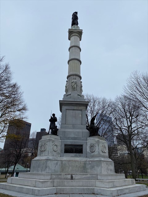The Soldiers and Sailors Monument on Boston Common was dedicated in 1877 to honor Massachusetts soldiers and sailors who died in the Civil War. Designed by sculptor Martin Milmore, the 126-foot granite column is topped by a bronze allegorical figure of America. Around its base are bronze reliefs depicting wartime scenes and carved figures representing different regions of the reunited nation.