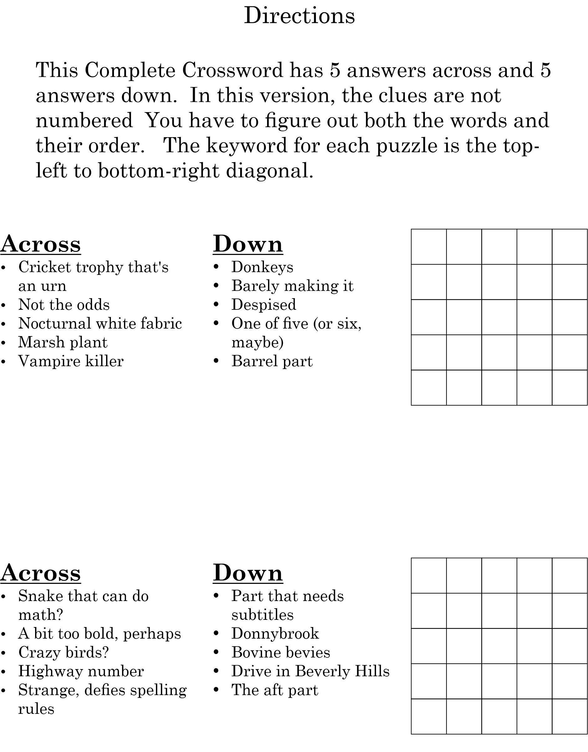 A complete crossword is one without any black squares. Every square has a letter. This is a 5x5 complete crossword, with 5 words across and 5 down, each 5 letters long. This time I don't tell you the orders of the answers, just which are across and which are down. It's not terribly difficult but a little more entertaining this way. Just fill our each puzzle and enter the letters along the diagonals into Certitude.