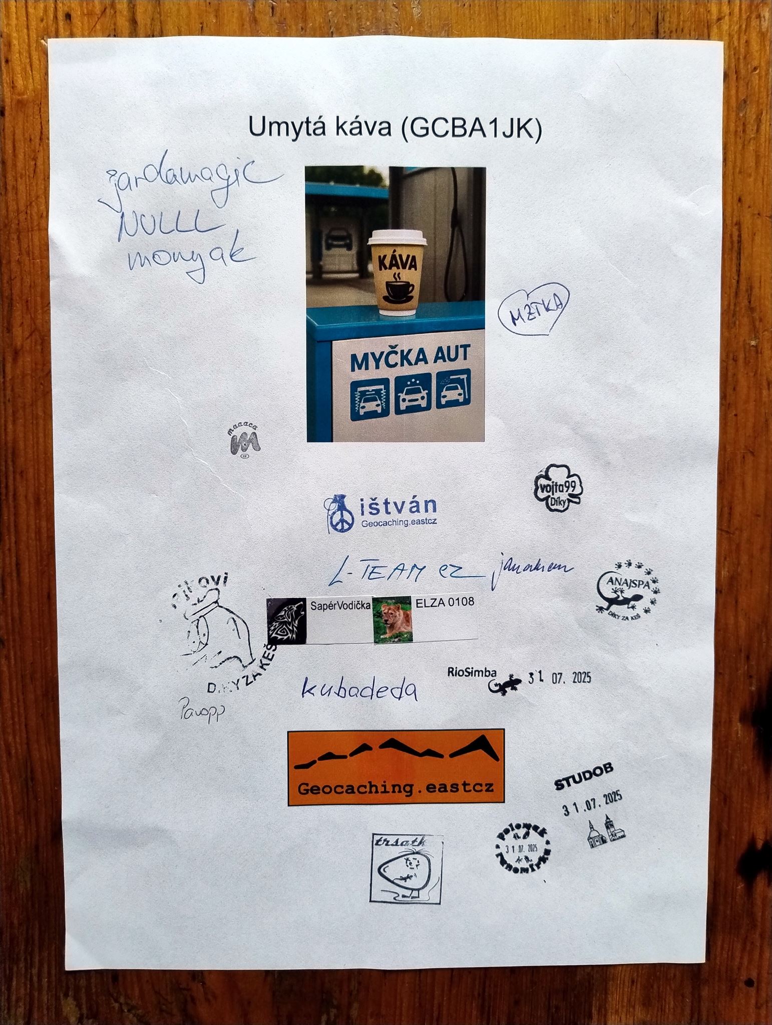 Pijte kavu! (GC7EWMV). Tento event se konal 30.11.2017 v jiné kavárně v Rychnově nad Kněžnou. CWG byla vyrobena v roce 2013 u firmy Gravoline.cz a vzniklo jich přesně 50 ks. Pijte kávu!