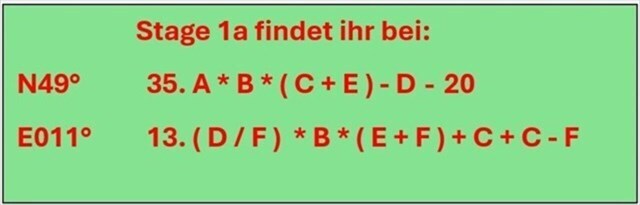 Wenn ihr alle Werte (A bis F) habt, könnt ihr durch das Einsetzen in die Formel den Outdoorteil angehen bei Stage 1a: