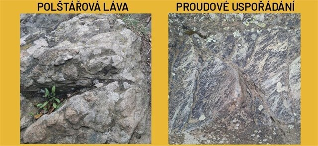 3) Na základě vašeho pozorování v terénu definujte, na kolika % plochy skalního masivu můžete pozorovat polštářovou lávu a proudové uspořádání (pojmy vysvětleny výše).