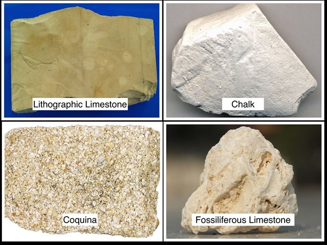 - Chalk: Chalk is a soft, fine grained limestone and is composed primarily of microscopic calcium carbonate plates from coccolithophores, a type of plankton. It forms in deep marine settings where these tiny organisms accumulate over long periods. Chalk is typically white or light gray in color.