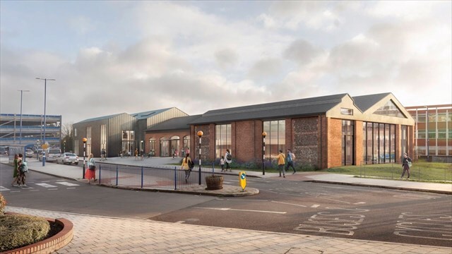 The original terminus station was built in 1854 after an original design by Isambard Kingdom Brunel. The station had one platform and a train shed that covered two broad gauge tracks. On one side of the train shed was a single road engine shed and on the platform side were a booking office and waiting rooms (on the Birdcage Walk side). The walls of the train shed, an engine shed and offices were constructed from brick and knapped flint with slate roofs. This building remained as a station in use until 1864 when it became a goods shed. Between the 1880s and 1940 various additions were made to the fabric of the old station. The building received grade two listing in 1999 due to being one of only six remaining GWR train sheds. Following listing most of the later additions were removed, restoring the building to its original footprint, the only addition being the flat roof second floor extension added in 1940.
