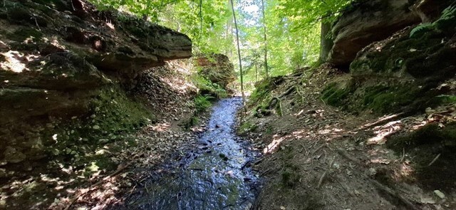2) Z přístupového waypointu sestupte až úplně dolů na úvodky. Jaké známky působení vodního toku na horninu zde vidíte?