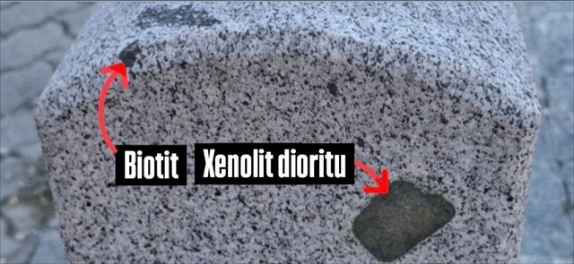 Dioritové xenolity dodávají granodioritům lokální barevnou pestrost a kontrastní texturu. Tyto tmavší vložky mohou vzniknout mísením magmat nebo začleněním úlomků okolních hornin.