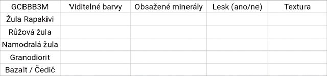 1) Tématem této EarthCahce je pět rozdílných hornin magmatického původu. Pojmenujte je a charakterizujte jejich minerální složení.
