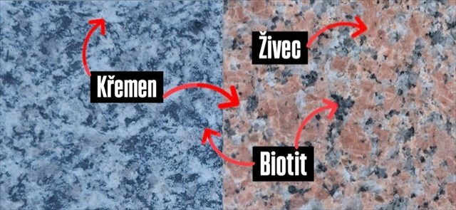 2) Na úvodních souřadnicích jsou pozorovatelné čtyři z těchto hornin. Jaké rozdíly mezi nimi na první pohled vidíte?