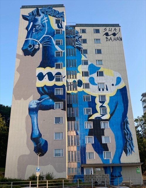 Partille har fått en del stora muralmålningar. Här är en av dem, en Dalahäst som pryder höghuset.