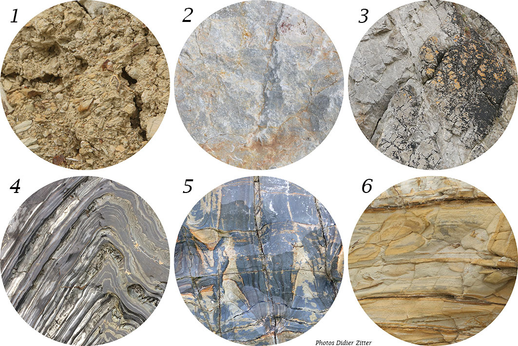 1. Des sédiments meubles. - 2. Un quartzite avec des traces d'oxyde de fer. - 3. Un quartzite sur une partie duquel des lichens de couleur jaune et des micro-organismes de couleur noir sont visibles. 4. Schistes zébrés non altérés. Les lits (couches) ont été déformés et sont pliés. - 5. Schistes zébrés en voie d'altération. - 6. Schistes zébrés très altérés.