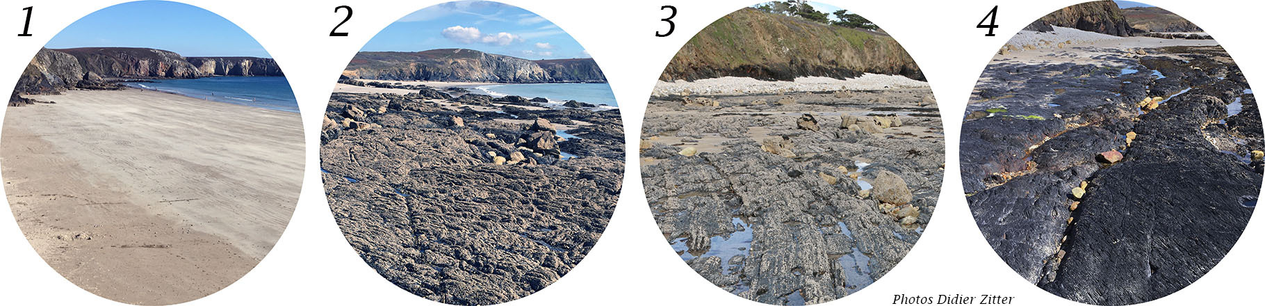 1. Du sable recouvre la plateforme, la roche sous-jascente n'est pas visible et ne peut donc pas être identifiée. - 2. La roche de la plateforme est presque entièrement recouvertes de balanes, des petits coquillages qui vivent en bancs serrés, pas facile d'identifier la roche. - 3. La roche est partiellement découverte, elle devrait pouvoir être identifiée. - 4. La roche de la plateforme est bien découverte, elle doit pouvoir être identifiée.