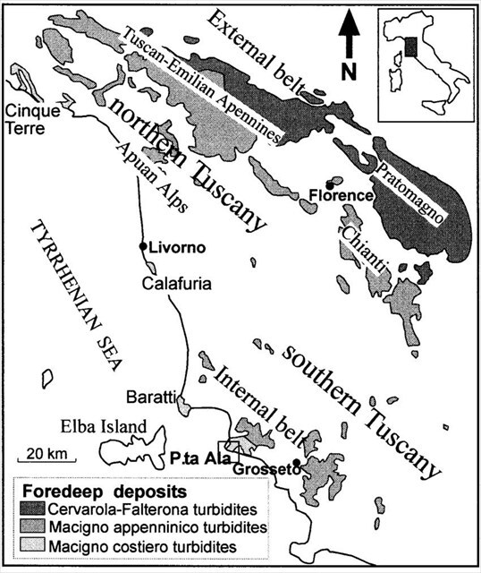 Pietra serena comes from the Macigno Formation, which is a turbidite. A turbidite is sediment that has been deposited as a result of turbidity flows, which can be pictured as an underwater landslide due to seismic activity (earthquakes) or gravitational forces (collapsing slopes, etc.). The deposition of sand in these underwater landslides laid the sentiment down for pietra serena stone, and pressure over time solidified it into rock.