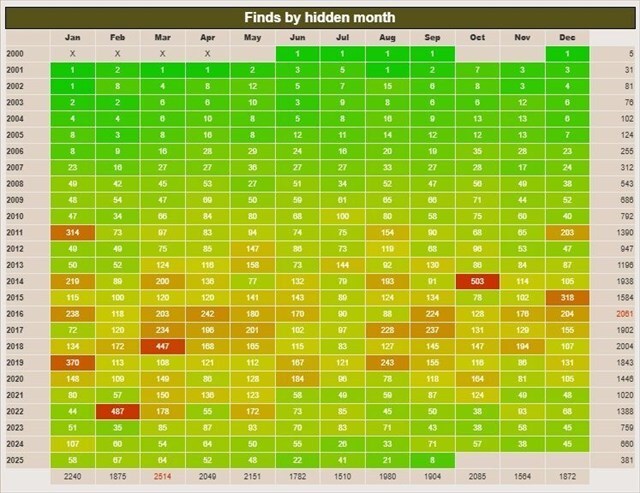 The “Jasmer Challenge” is a challenge to find at least one hidden cache in each month since May 2000, when the first cache was hidden. It was named after jasmerb, the founder of the first cache that set this requirement. It is The Jasmer Challenge (Northern California Edition). This challenge also requires some travel, as some combinations are not and have never been available in Europe. However, we will focus on caches that can be found in Europe. This will not be easy either, although caches located outside of Europe can also be used to meet the logging requirement.