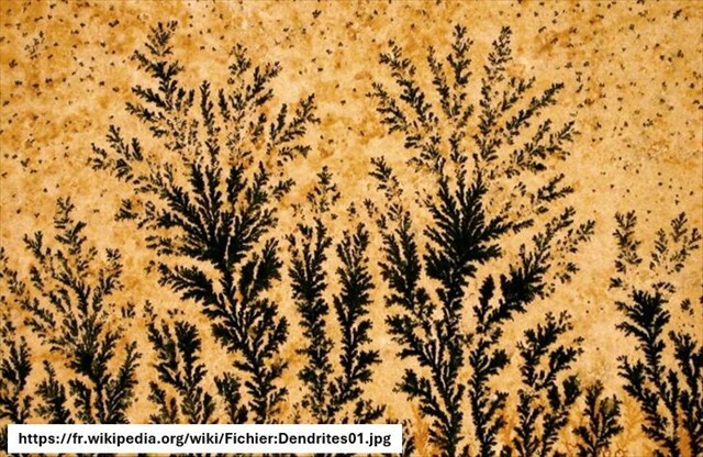 Les dendrites de fer (ou plus précisément dendrites de minéraux riches en fer et manganèse) sont des figures naturelles en forme de petites branches ou fougères qui se forment à la surface de certaines roches.