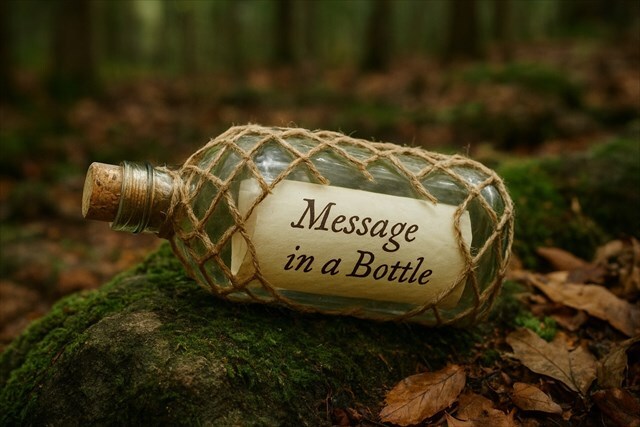 Long ago, a sailor set his words adrift upon the waves, sealed inside a bottle. The currents carried it across oceans, rivers, and streams, but its journey did not end at the water’s edge. Miraculously, it wandered far inland. Now the bottle rests here, tucked away among the trees and stones. What message has survived its impossible voyage? There is only one way to know...