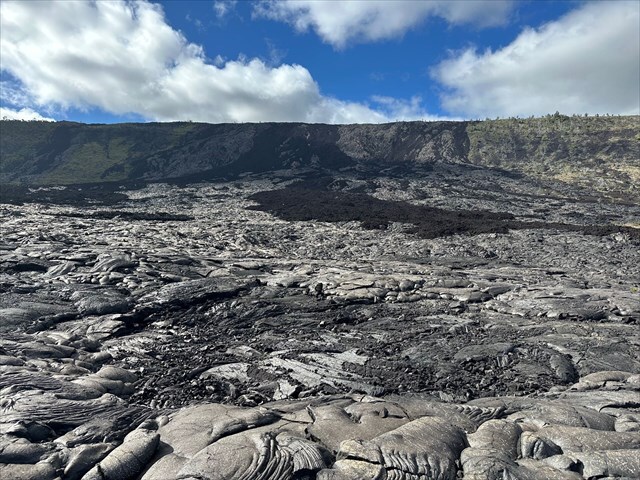 - Estimate the relative proportion of a'a lava to pahoehoe lava. Next, observe the pāhoehoe lava that is visible. Which types can you identify, and what do these textures reveal about the conditions under which the lava formed?