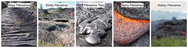 Pāhoehoe lava can be further subdivided into different forms based on variations in texture and surface features.: