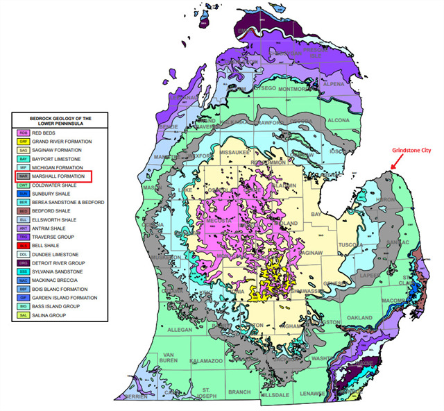 The Marshall Formation originated around 330–340 million years ago, when rivers transported quartz-rich sand from the Appalachian highlands into the shallow Michigan Basin. As sea levels dropped during a regression, these sands spread across coastal plains, deltas, and shoreface areas, creating a widespread layer of sandstone over the deeper Coldwater Shale. Waves and currents then reworked the sediment, resulting in well-sorted, cross-bedded quartz sandstone. Subsequently, rising sea levels submerged the formation, depositing marine limestones and shales from the Michigan Formation on top.