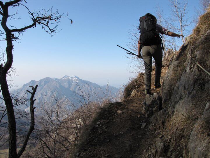 Dal parcheggio si inizia risalendo una stradina asfaltata privata (via alle Foppe) che con moderata pendenza ci porta fuori dall'abitato. Giungeremo quindi a un bivio segnato in cui proseguiremo a destra iniziando ad aumentare la ripidità del percorso seguendo i segni bianco-rossi presenti. Proseguiremo in pendenza moderata fino al primo tratto attrezzato (30' dal parcheggio).