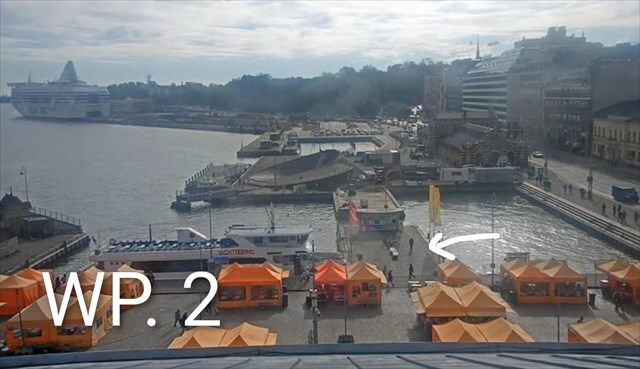 Etelä-Sataman kamera lienee kaupungintalon katolla. Se näyttää kolmea paikkaa satamassa pari kierrosta minuutissa. Se on paikallaan 10-15 sekuntia. Tämä on toisin kuin tiekameroiden kuvissa, jossa kuva vaihtuu yleensä 10-15 minuutin välein. Miitti on yhdessä näyttöpaikassa ja olen merkinnyt kaksi muuta reittipisteisiin.
