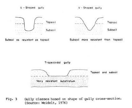 - U-shaped gullies – broad base with gently sloping sides, common in softer, more erodible materials.
