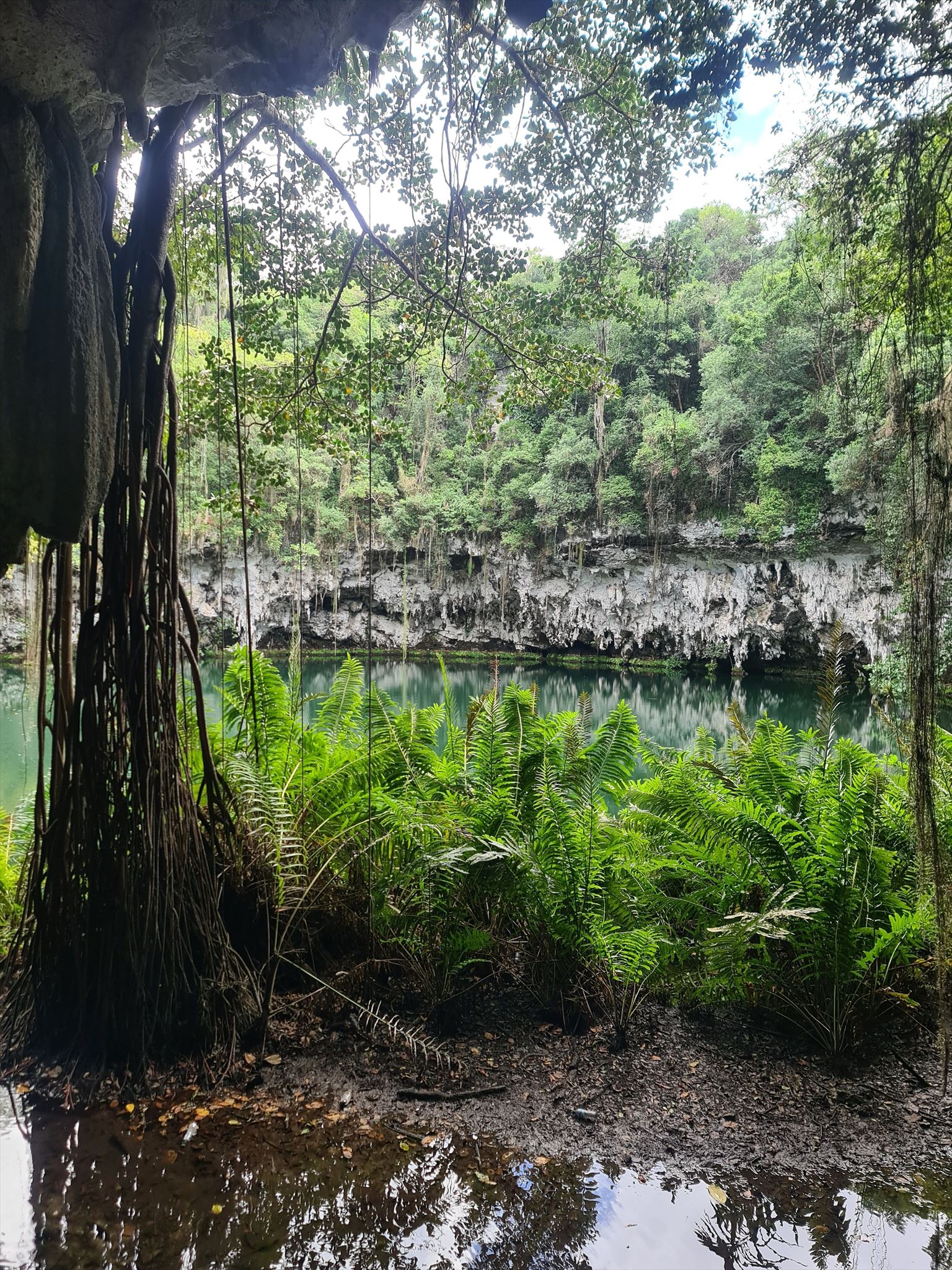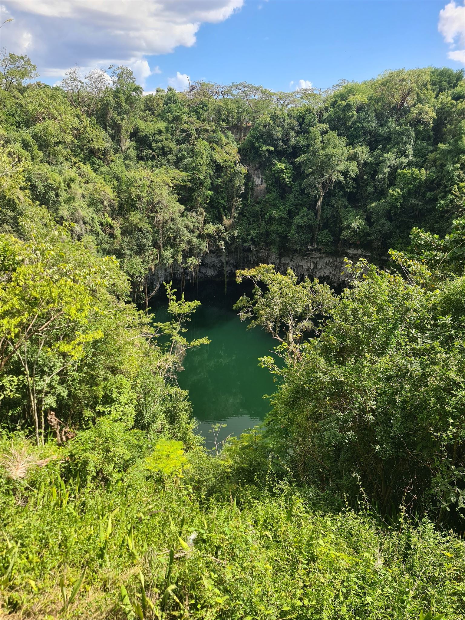 Un cenote es un sumidero natural inundado de origen kárstico, que se encuentra principalmente en la península de Yucatán, México, donde existen miles, pero también se pueden observar en muchas islas del Caribe. Se forman por el colapso de la roca caliza, dejando expuestas las aguas subterráneas. La palabra "cenote" proviene del término maya para pozo o abismo. Para los antiguos mayas, los cenotes eran una importante fuente de agua potable y una puerta de entrada al inframundo maya. Hoy en día, son populares para nadar, practicar snorkel y bucear en sus aguas cristalinas.