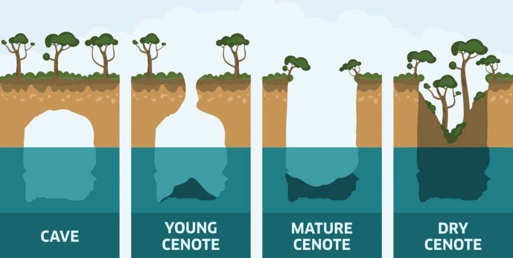 Los cenotes son un resultado directo de la historia geológica. Con el tiempo, gruesas capas de piedra caliza se acumularon a partir de organismos marinos, formando una plataforma que quedó expuesta al bajar el nivel del mar. Esto dejó en la península un lecho de roca caliza porosa, que sirvió de base para la formación de los cenotes.