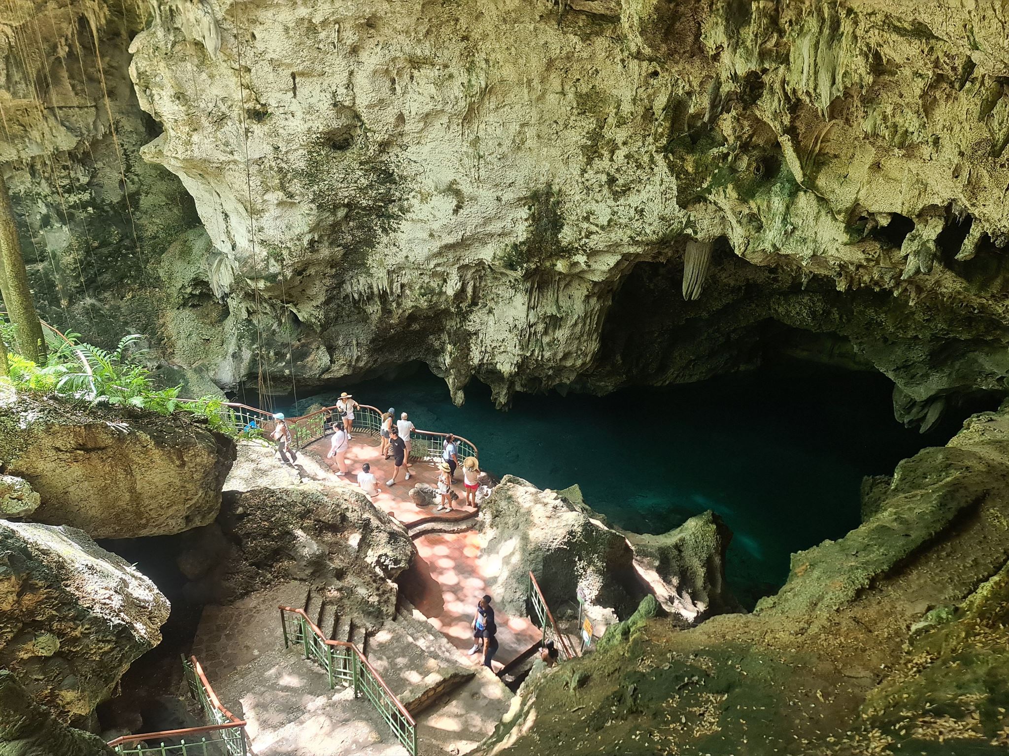 The site was created centuries ago as a result of tectonic fractures when caves collapsed, forming a bowl-shaped depression which subsequently filled with water. Initially, the cave was used by the indigenous Taíno Indians for religious rituals and fertility rites. The Taíno were the first inhabitants of the Hispaniola island. The three main lakes are called "Lago de Azufre" (discovered in 1916), "La Nevera" and "El Lago de las Damas". Some of the lakes also have openings on the outside. A staircase carved into the rock gives access to the first cave while a boat takes visitors across the second lake to give access to a fourth lake called "Los Zaramagullones". This lake is not considered one of the three "eyes" or main lakes, as it has an opening to the outside.