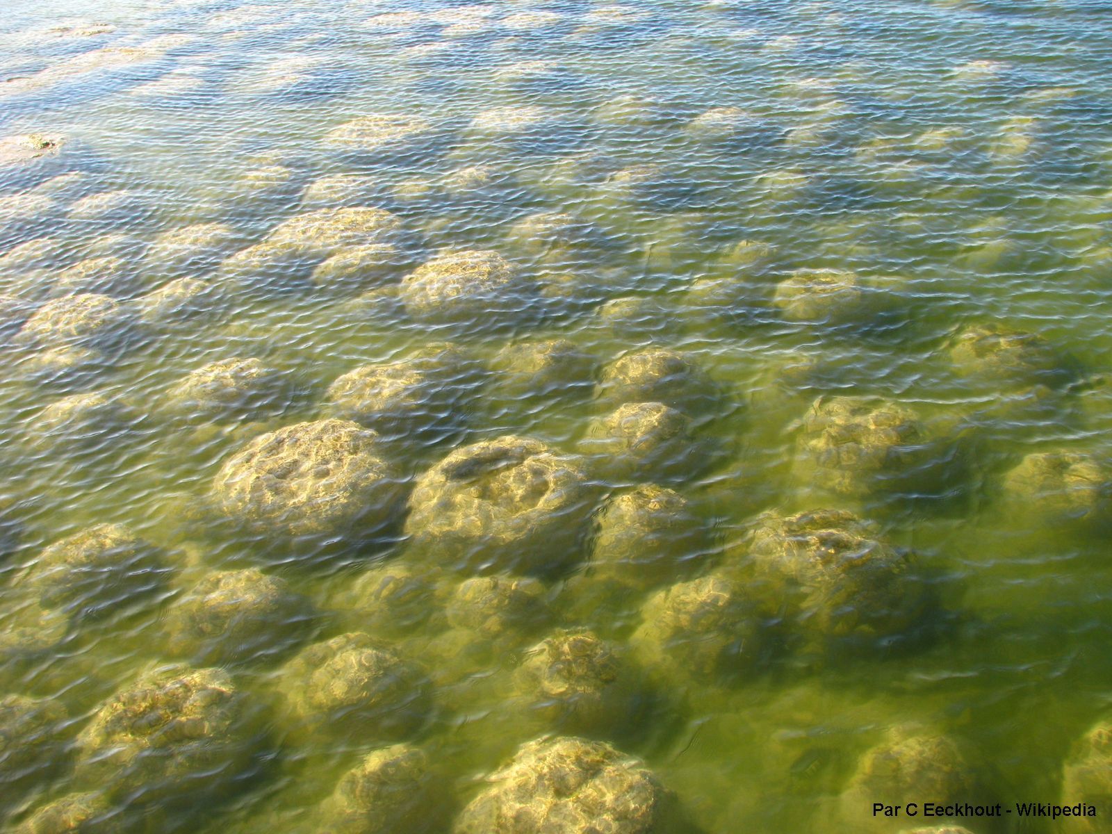 Les stromatolithes sont des constructions fossiles, généralement carbonatées, constituées d’une superposition de fines couches millimétriques. Ils comptent parmi les plus anciens macrofossiles connus, certains remontant à 3,5 milliards d’années en Australie. Ces structures se distinguent par leur origine biologique, liée à l’activité de micro-organismes, principalement des cyanobactéries, et par leur morphologie particulière, souvent en colonnes, dômes ou cônes. La croissance des stromatolithes repose sur deux mécanismes principaux. Dans le premier cas, les tapis bactériens piègent mécaniquement des particules minérales, qui s’accumulent couche après couche. Dans le second, la photosynthèse des cyanobactéries consomme du dioxyde de carbone, ce qui favorise la précipitation de carbonates de calcium dans l’environnement.