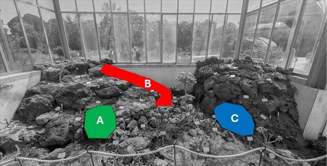 After entering the greenhouse, look for the observation area on the Jardin des Plantes side, in the center of the walkway (see photo WP1).