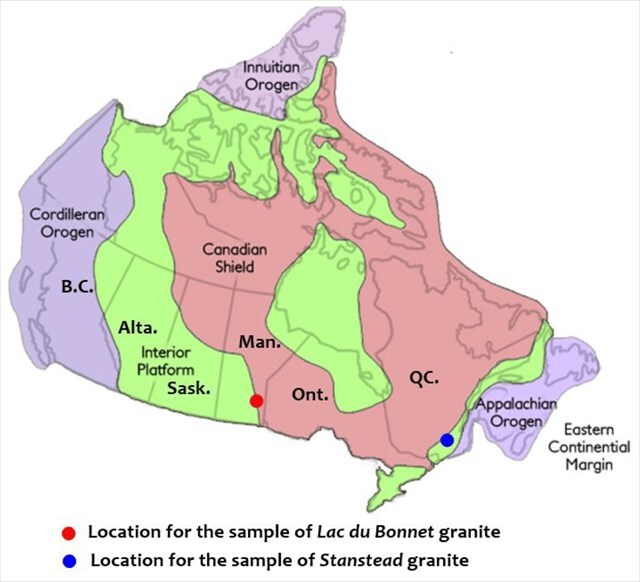 The pedestal is constructed from Royal Canadian Red Granite which was quarried in Manitoba. It was formed roughly 2.7 billion years ago during the Archean Eon, deep within the Earth’s crust when molten magma slowly cooled and crystallized over the course of millions of years. This granite was part of the ancient Lac du Bonnet Batholith of southeastern Manitoba (more on that later). Over time, tectonic uplift and erosion exposed this ancient granite at the surface, where it has been quarried. The stone has a compressive strength of about 182 MPa, a low water absorption rate of 0.16%, and a density of 2,650 kg/m³, which makes it highly resistant to weathering. |