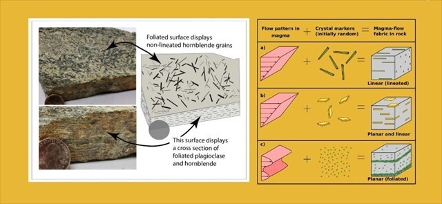 In contrast, other minerals, such as amphibole, have the shape of long needles or columns. These minerals can align in a single direction during rock formation, similar to pencils arranged parallel to each other. This kind of arrangement is called lineation, because the minerals form lines or directional textures rather than flat layers.