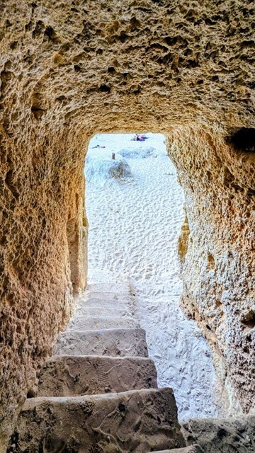 Praia do Carvalho is a small, sheltered cove on the rocky Algarve coast between Benagil and Carvoeiro. The beach is hidden behind high cliffs, and access is through a tunnel carved into the rock. Even on the way through this tunnel, you can observe the geological structure of the Algarve up close: light limestone with fossil inclusions, layer boundaries, color variations, and small cavities. They tell the geological story of a coastline that once lay at the bottom of a warm, shallow sea.